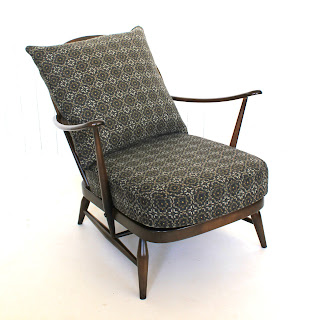 Ercol 203 armchair in dark finish reupholstered in Melin Tregwynt Vintage Rose Olive 100% wool fabric.